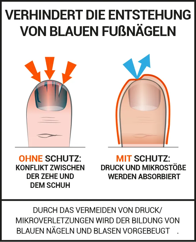 Diese Schutzkappen wurden speziell für Sportarten entwickelt, bei denen die Zehen wiederholten Stößen gegen den Schuh ausgesetzt sind. Sie verringern den Druck auf die Zehennägel und dämpfen Mikrostöße.